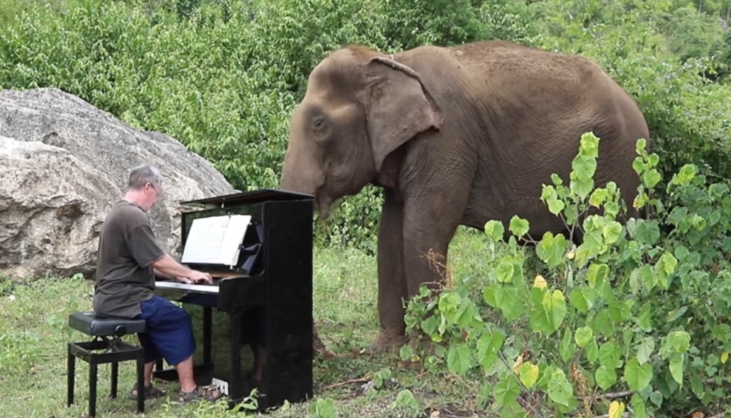 코끼리에게 피아노 음악을 들려주는 영상.